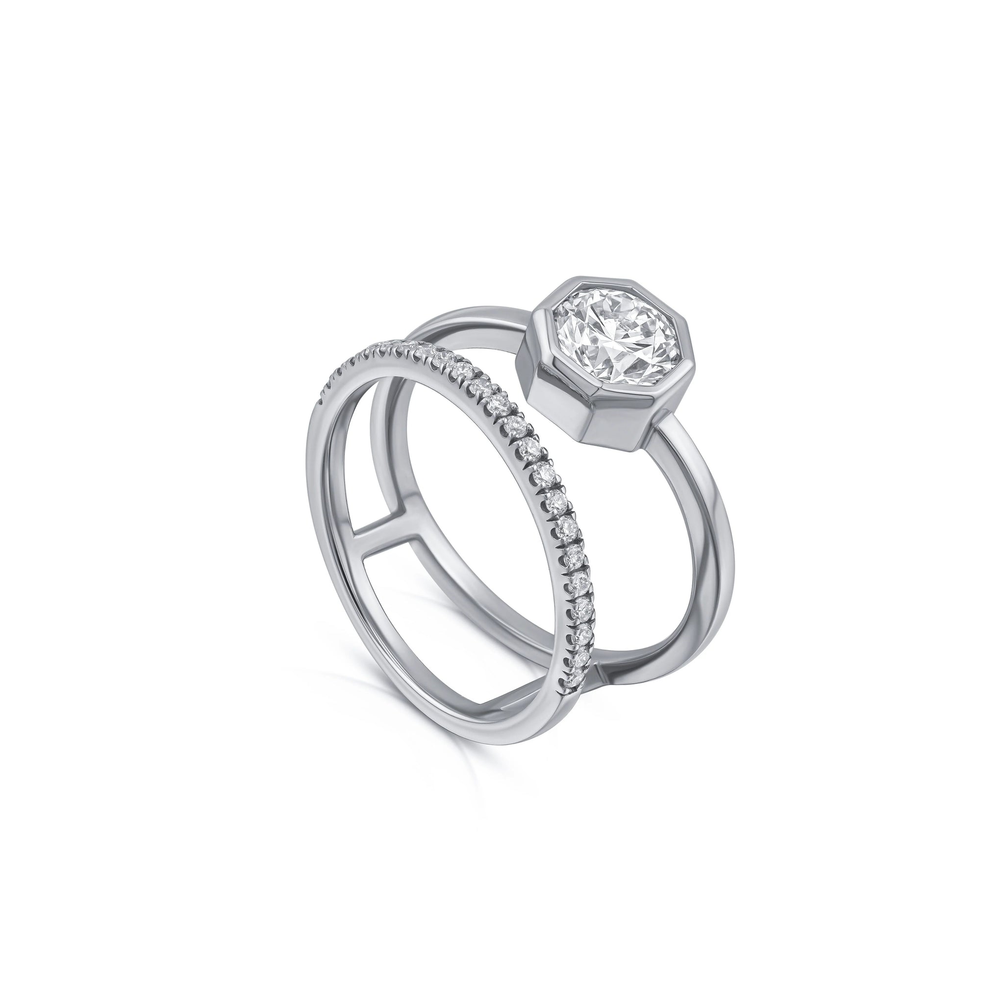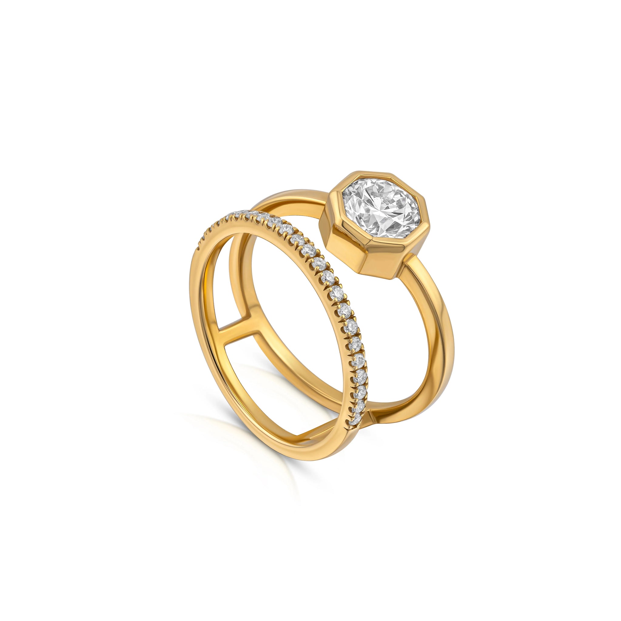 Make a statement. Our two-in-one round-cut diamond engagement ring breaks tradition, unifying a gold band and engagement ring from behind, unlike conventional designs. Set in a hexagonal bezel and with an additional eternity band, it adds a touch of luxury to your wedding day and the joyful days beyond.